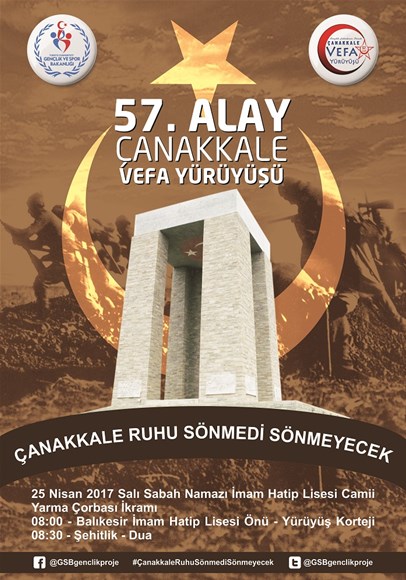 Gençlik ve Spor Bakanlığı tarafından “Çanakkale Ruhu Sönmedi Sönmeyecek” sloganıyla 81 ilde 25 Nisan Salı Çanakkale şehitlerine 57. Alay Vefa Yürüyüşü düzenlenecek.