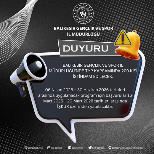Balıkesir Çalışma ve İş Kurumu İl Müdürlüğü ile Balıkesir Gençlik ve Spor İl Müdürlüğü arasında imzalanan protokol kapsamında, kurum bünyesinde yürütülecek Toplum Yararına Programı (TYP) ile 200 kişi istihdam edilecektir.